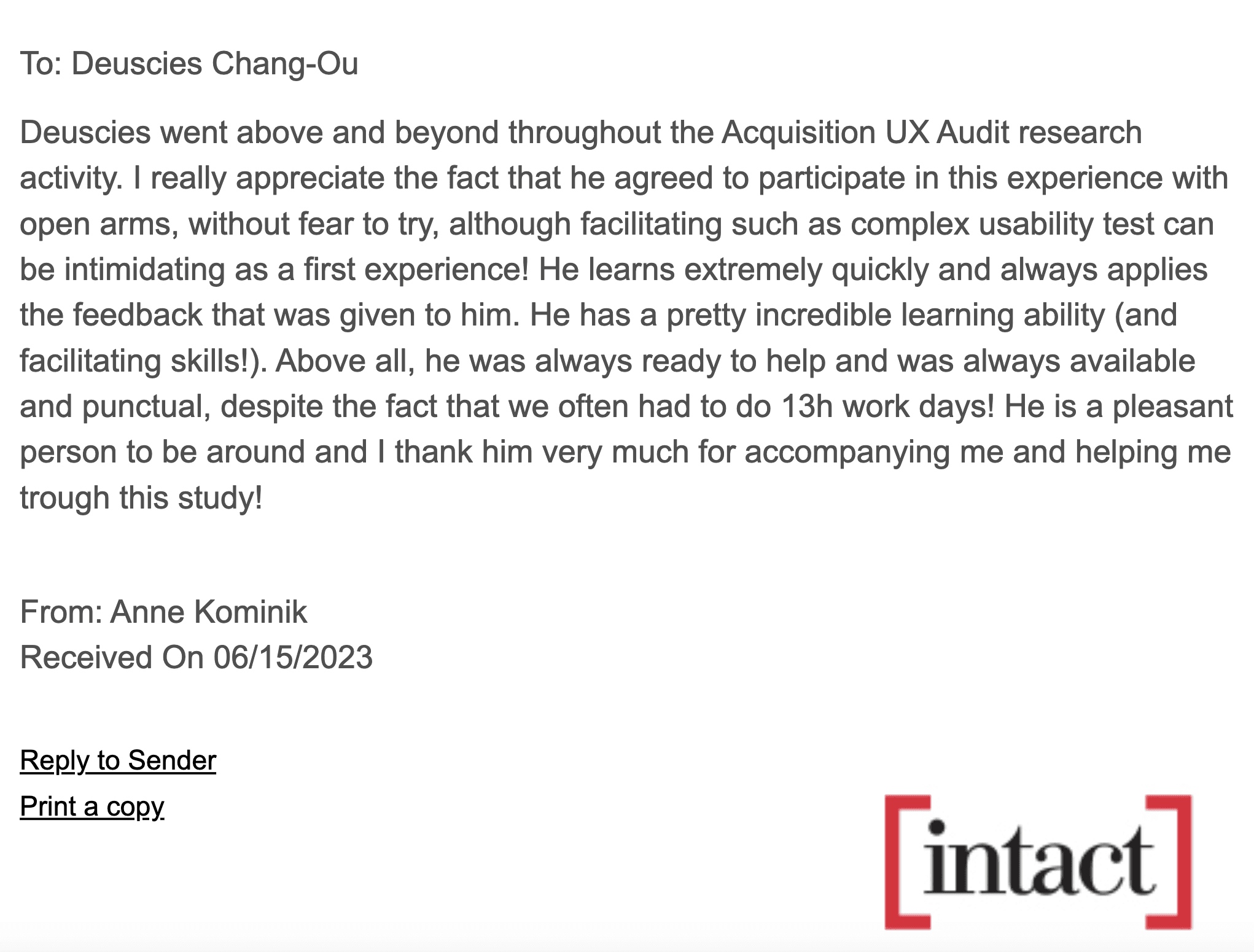 The researcher expressed amazement of being able to moderate these 3 tests one after the other without knowing anything about the topics prior, simply by following my folders' instructions