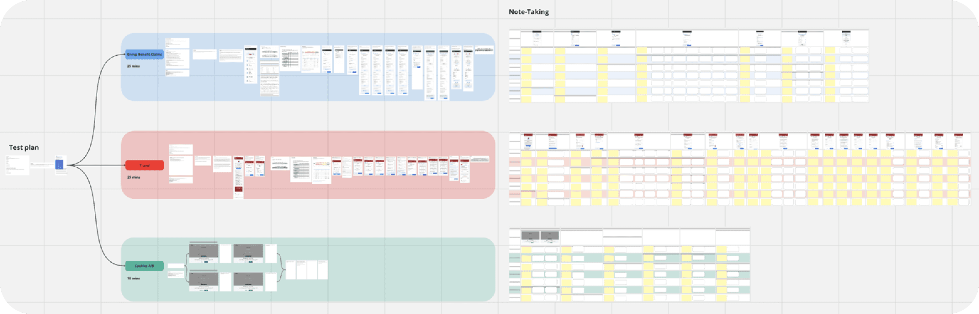 I planned these three tests simultaneously on Miro, wrote 3 different moderator guides and printed test materials